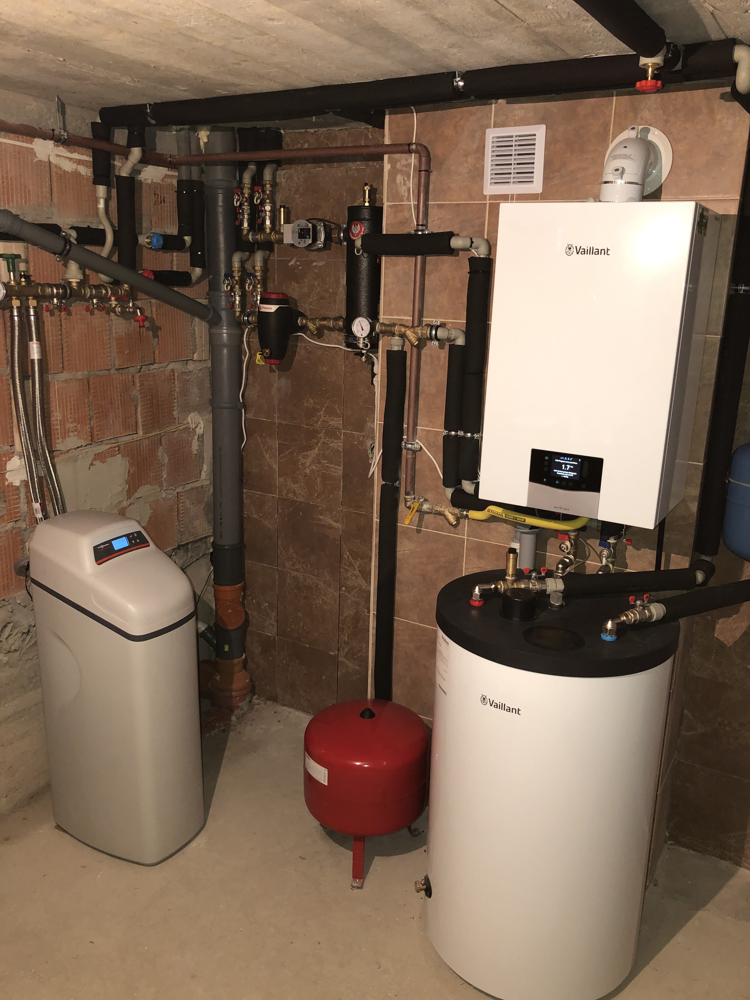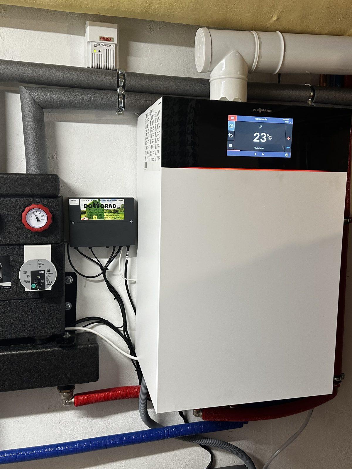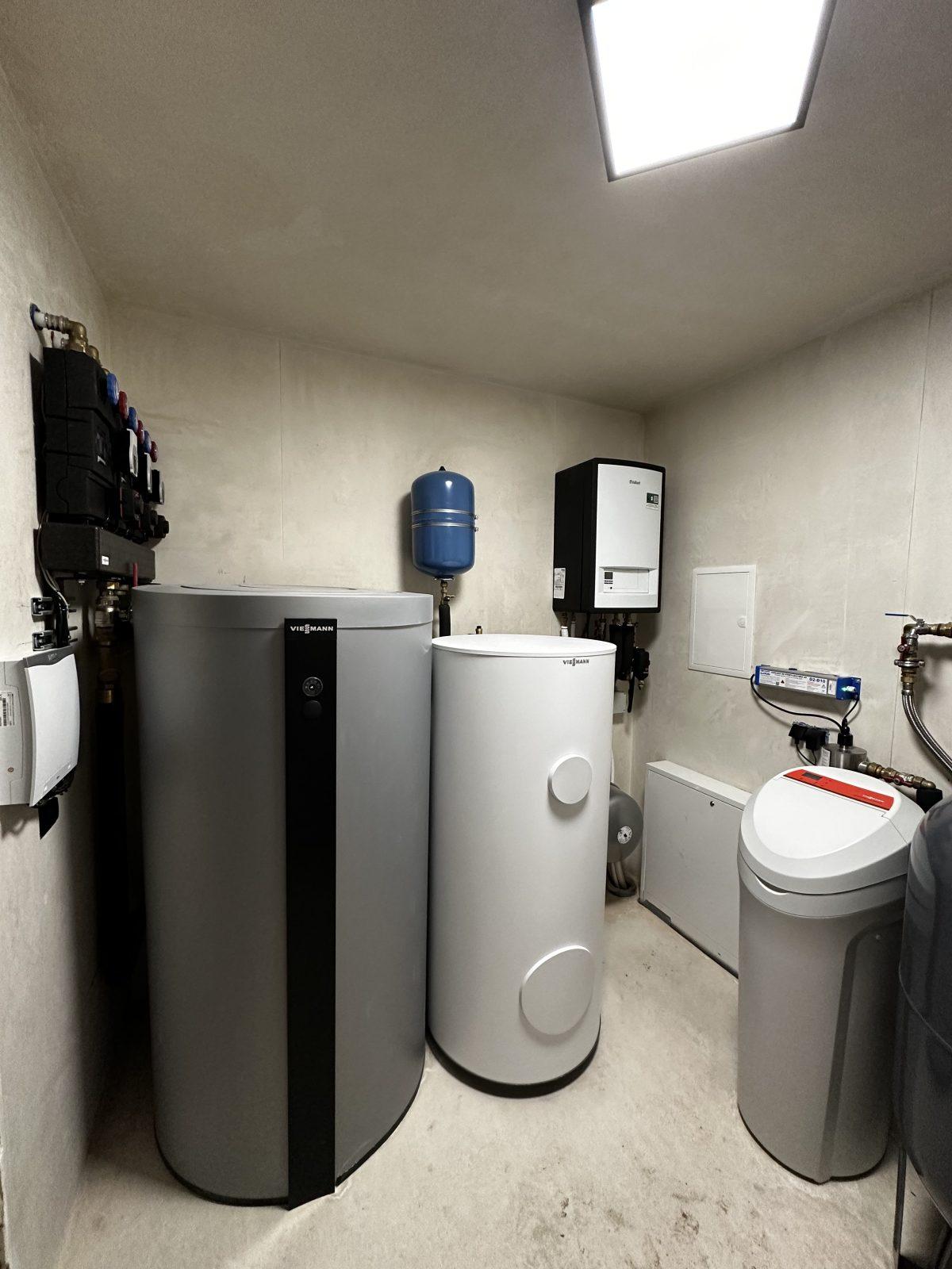 Pompa ciepła typu split zainstalowana z zasobnikiem ciepłej wody użytkowej, buforem wody grzewczej oraz grupą pompową trzech obiegów grzewczych ogrzewania podłogowego z zaworem mieszającym. Dodatkowo zainstalowana stacja uzdatniania wody studziennej Viessmann Aquahome Mix SMART